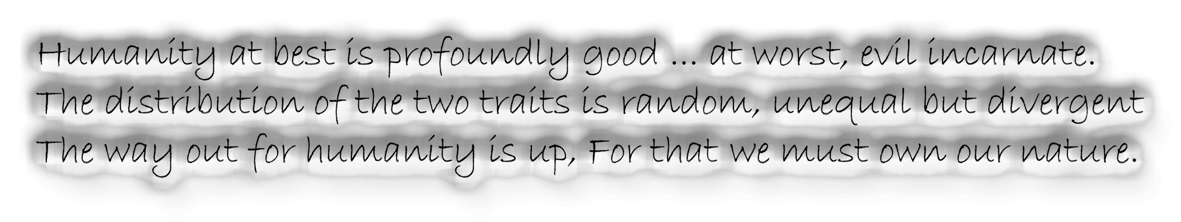 It seems unlikely that a writer would begin their expressions of a belief without leaving space on the page for doubt. My perceptions of humanity are presented in that way. I do realize that I, like countless others that are sufficiently foolish, bold or brash, to point out one or two of man's shortcomings will forevermore be reviewed as 'misanthropes' and the subject of endless ire: I give you my personal assurance I wouldn't do this if I didn't believe even that could be fun.